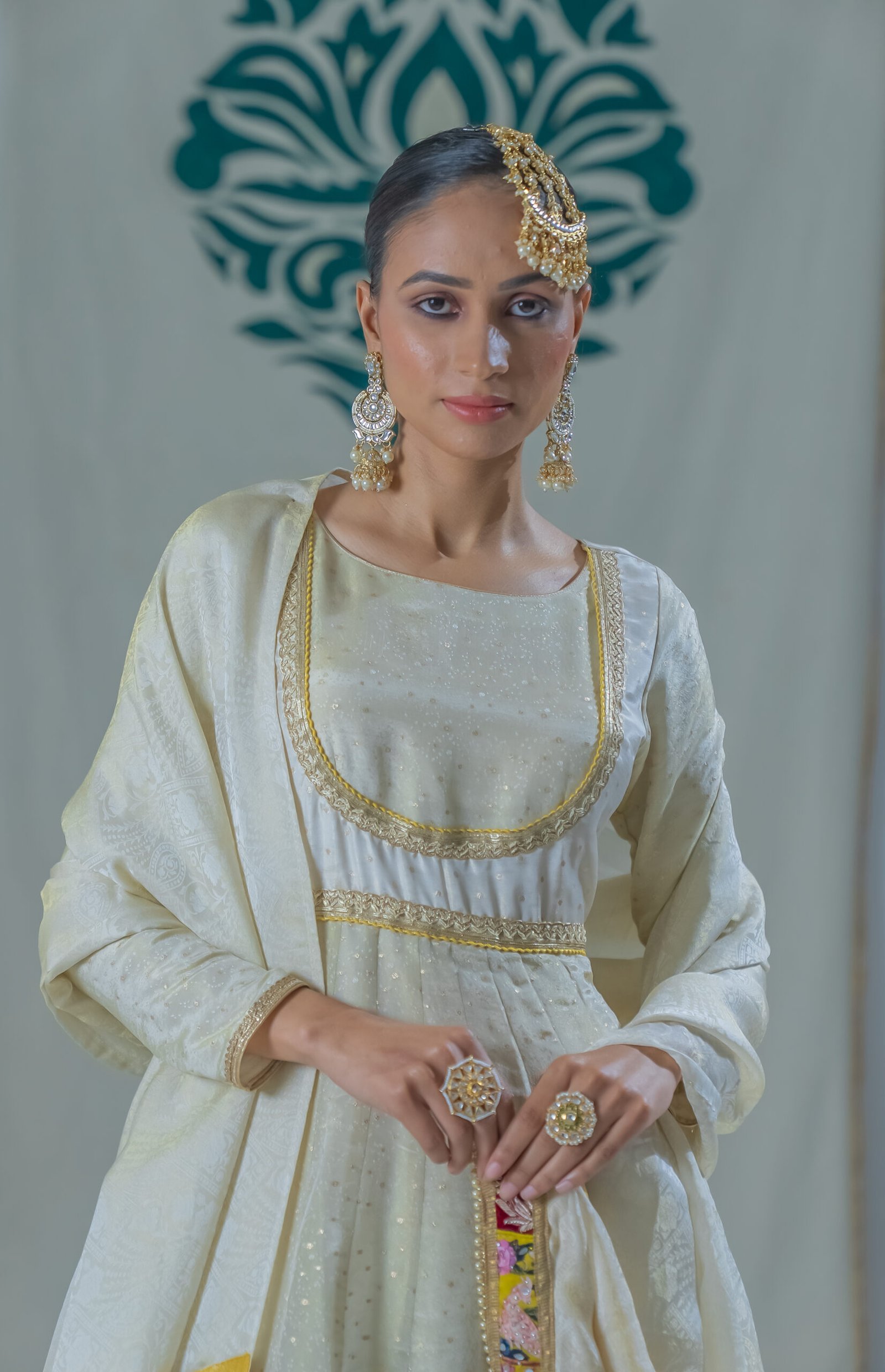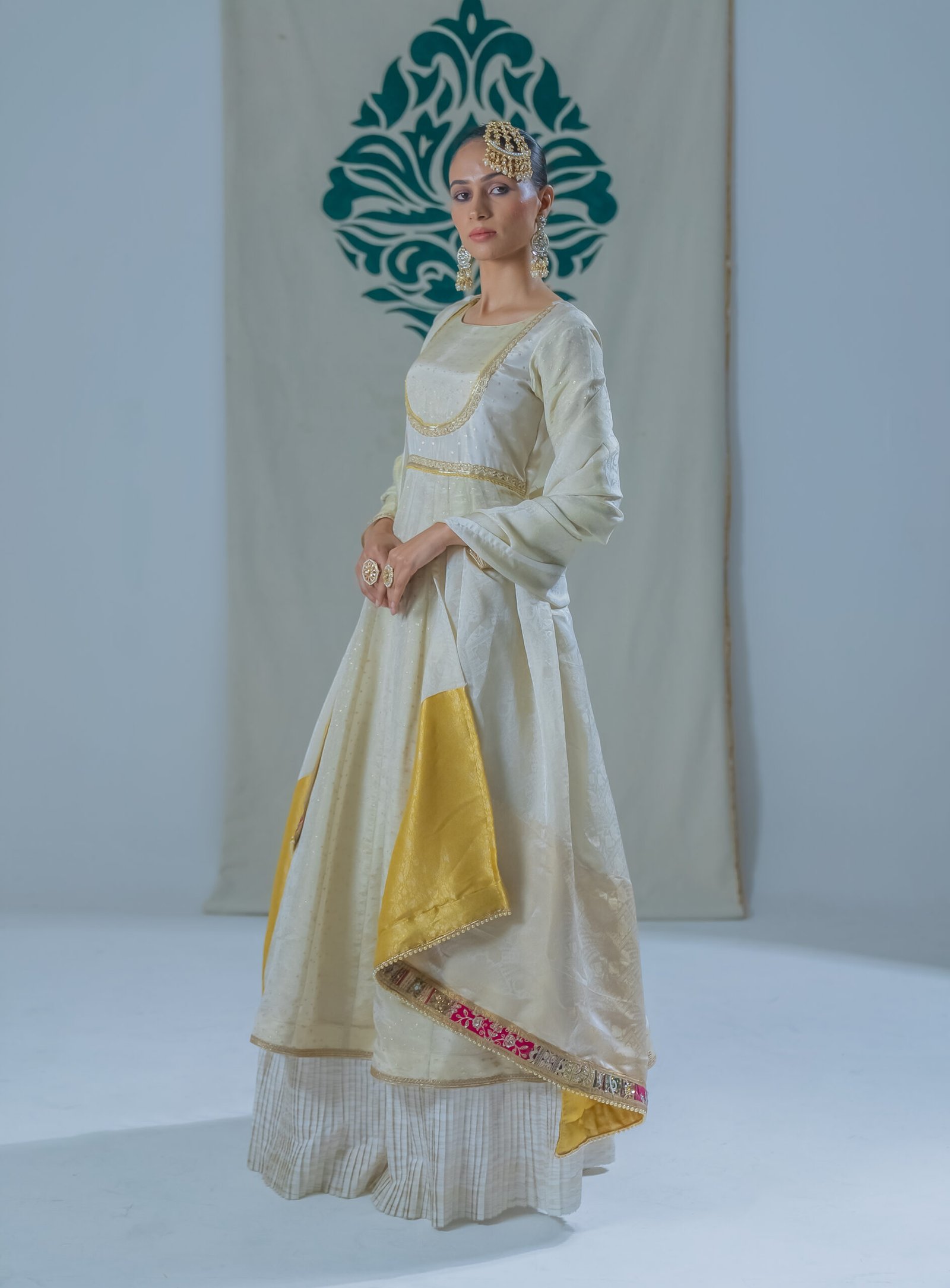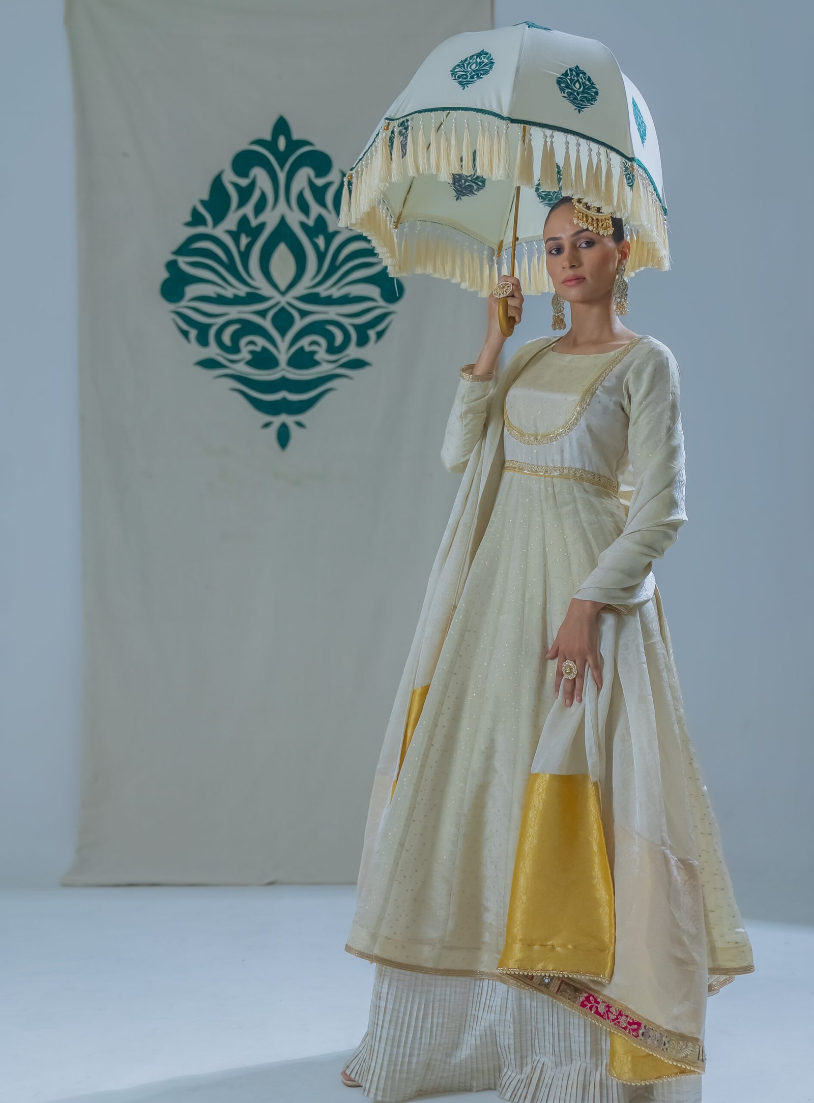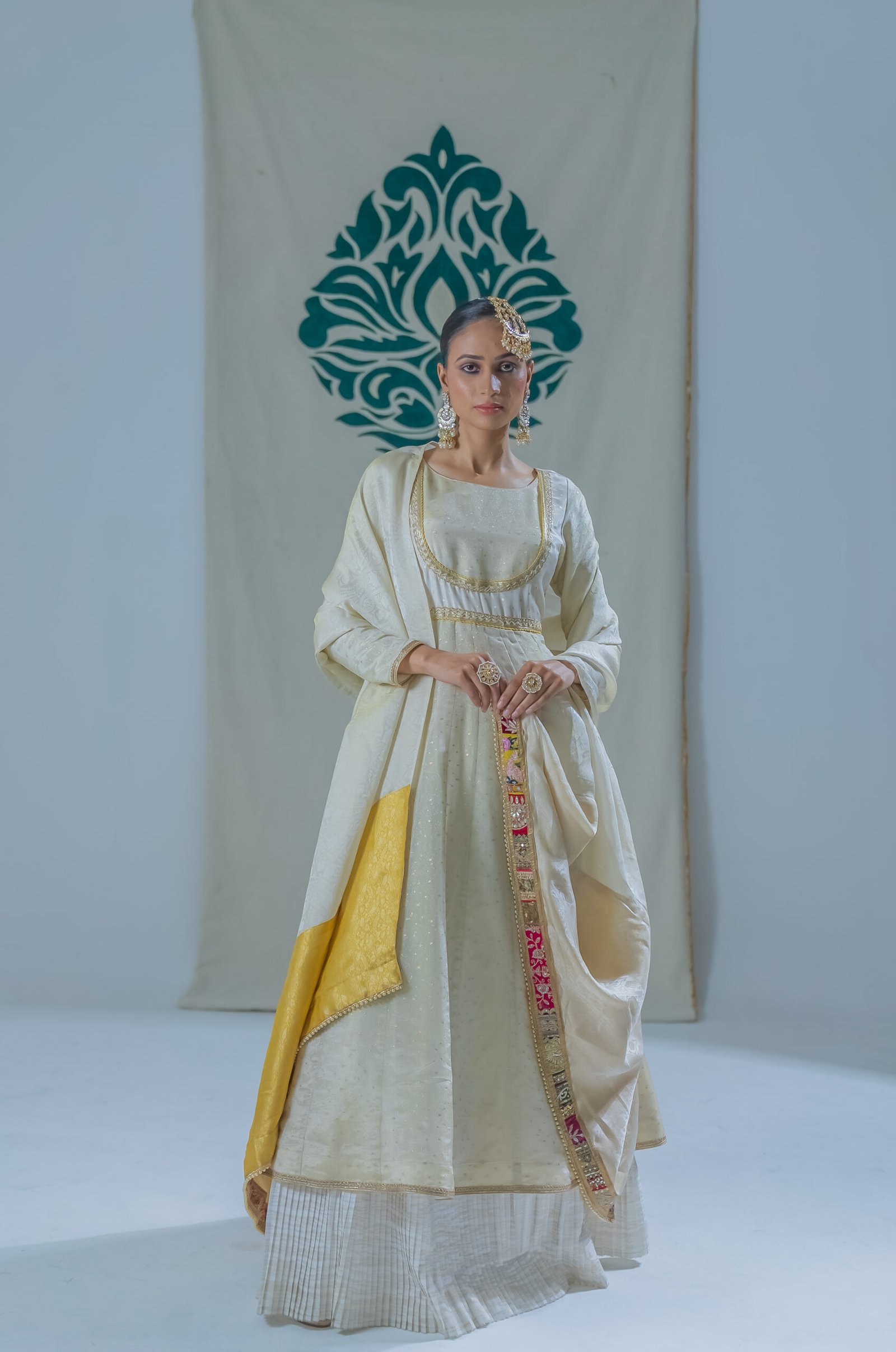 Fabric – Tissue silk anarkali with zari motifs , pleated silk skirt , banarasi silk dupatta