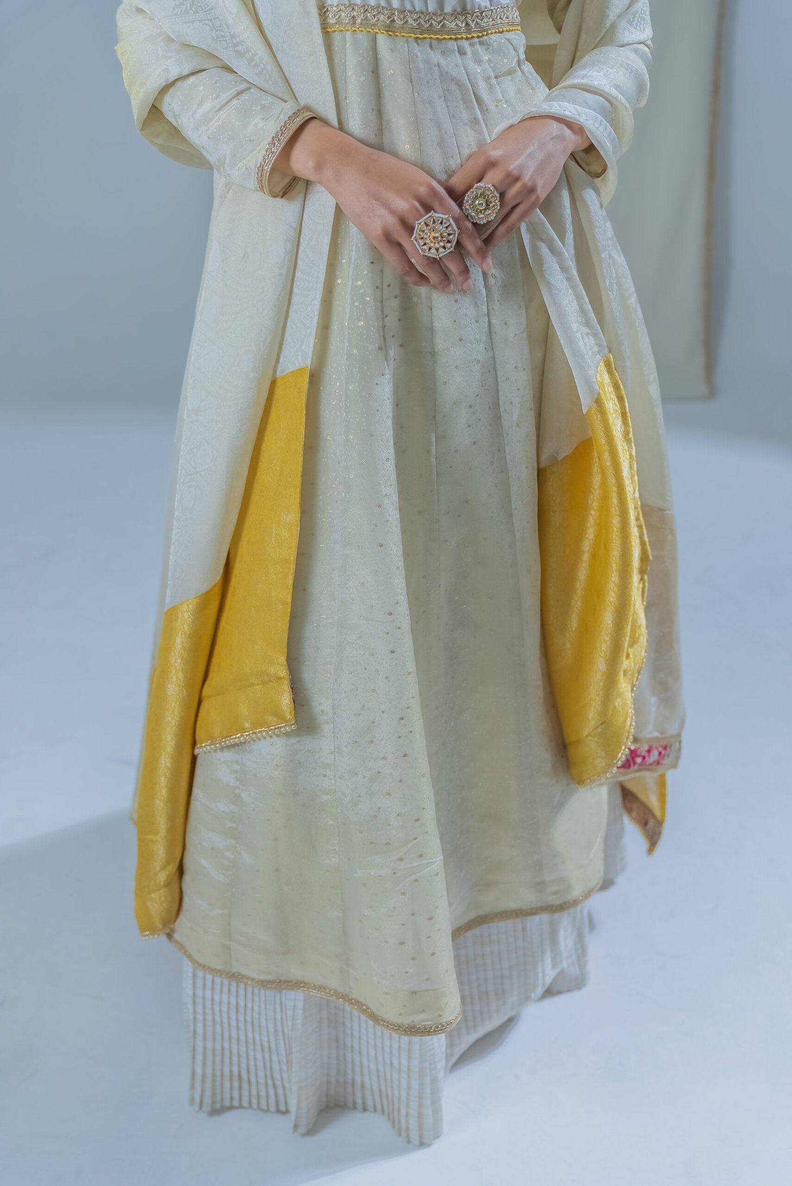 Detail – stitched jacket with anarkali, caned skirt, self print detail on dupatta